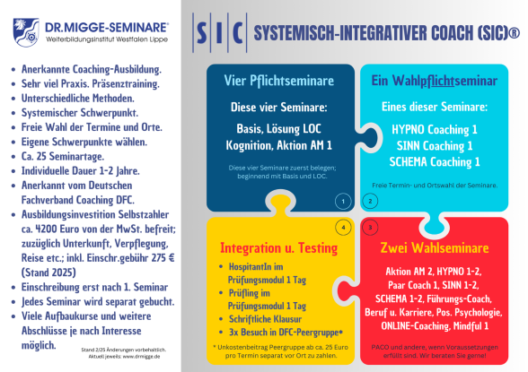 Praktische Coaching-Ausbildung zum Systemisch-Integrativen Coach (SIC)® - in verschiedenen Städten Deutschlands. In frei wählbaren Modulen erlernen Sie professionell zu coachen: Sie bestimmen Zeit und Datum der Module! Die Ausbildung ist systemisch-methodenübergreifend, mit Elementen des lösungsorientierten Coachings, des tiefenpsychologischen Psychodramas, mit praktischen Aktionsmethoden, der Kognitionsarbeit, Elementen praktischer Philosophie und der hypno-systemischen Arbeit. Wir legen viel Wert auf Persönlichkeitsentwicklung, Haltung, Ethik und bieten sehr viel Praxis im Kleingruppentraining an echten Anliegen der Teilnehmenden. Die Investitionskosten liegen um die 4900 Euro. Die verschiedenen Ausbildungsorte und Termine mit PDF-Prospekt, finden Sie auf drmigge.de.